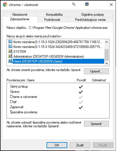 Co myslíš tým skontroľovať práva? Chrome je nainštalovaný tuna: C:\Program Files\Google\Chrome\Application Nachádza sa tu chrome.exe Klikol som pravým, vlastnosti, kompatibilita, spustiť tento program ako správca + som klikol na zmeniť práva pre všetkých užívateľov a klikol som tiež na "spustiť...