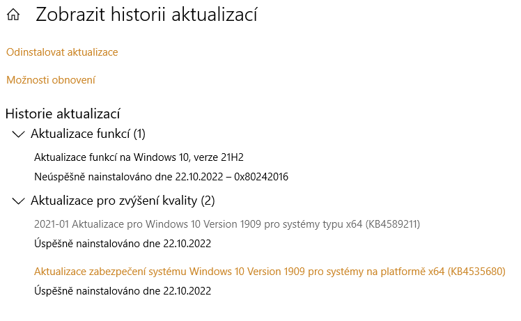 Tak zatím bez úspěchu. Ani 22H2, zítra zkusím spustit upgradez USB flashky. WU4.png WU13.png Event log: Název protokolu:Application Zdroj: Windows Error Reporting Datum: 22.10.2022 23:41:10 ID události: 1001 Kategorie úlohy:Není Úroveň: Informace Klíčová slova: Klasické nastavení Uživatel: Není k di...