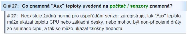U staršího PC jsem měl také potíže s přehříváním a procesor, ani GK to nebyla. Jsem vybaven digitálním měřením teploty a tak jsem zjistil, že se jedná o přehřívání chipsetu, který měl jen pasivní chladič. Nainstaloval jsem na něj ventilátor a je to OK. Také se silně zahřívají výkonové tranzistory na základní desce, které upravují napájení jednotlivých dílů desky a ty též asi nemají žádné teplotní čidlo. Protože bývají poblíž patice procesoru pomáhá je chladit ventilátor procesoru, pokud fouká proti základní desce a ne bokem na chladič procesoru, jak to mají některé jinak výkoné chladiče procesoru. Máš-li možnost, kus si uvedený měřič a teplotním čidlem od někoho vypůjčit, aby jsi zjistil co je ten AUX.