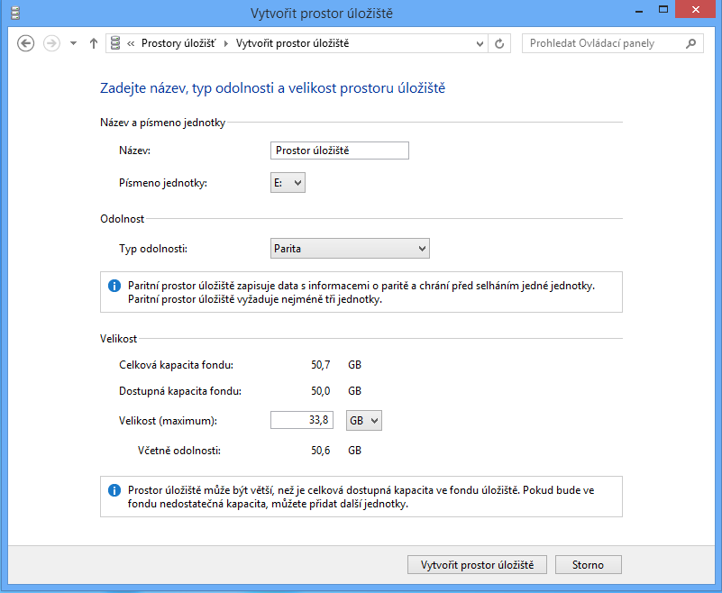 Funkce Prostory úložišť též umí bez ochrany před selháním disku využít diskový fond pro spojení kapacity více disků do jednoho velkého virtuálního úložiště. Už se vám tak nemusí točit hlava z nových a nových diskových písmenek, jak s řešením nedostatku místa pro data přidáváte nové a noví pevné disky. Pro náročnější uživatele je tu pak ještě při dostupnosti tří disků paritní ochrana před selháním jednoho z nich.
