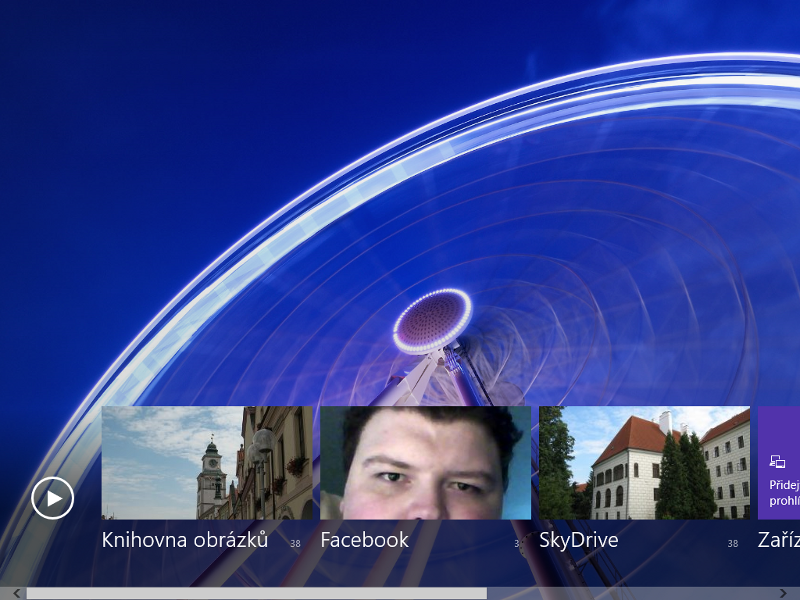 O něco lépe si vede aplikace Fotky (Photos), která je schopná prohlížet jak fotky uložené na pevném disku počítače, tak fotky z úložiště SkyDrive, služby Flickr nebo sociální sítě Facebook. Po aktualizaci navíc i z jiných počítačů v místní síti resp. domácí skupině anebo síťového úložiště. Jenže jde téměř výhradně o čistokrevný prohlížeč.