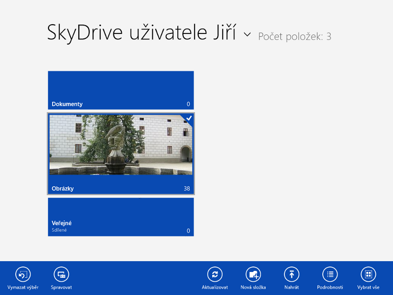 Slabiny se též najdou nahrávání nových souborů z počítače do úložiště. Zatímco webové rozhraní podporuje jednoduché přetažení souborů z plochy nebo průzkumníka, tak v aplikaci SkyDrive pro Modern UI k nahrávání slouží výhradně poněkud těžkopádný správce souborů, který navíc neumožňuje nahrát celé složky. Je nutné si složku v úložišti nejdříve založit a pak do ní nahrát jednotlivé soubory ze zdrojové složky na pevném disku. Alespoň, že je podporován hromadný upload.