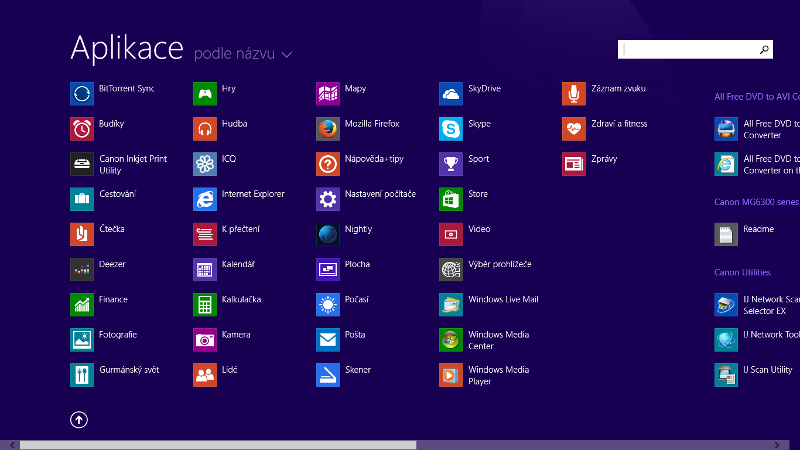 Obrazovku Aplikace lze otevřít ze sesterské obrazovky Start pomocí šipky v její dolní části. Rovněž je možné nastavit, že obrazovka Aplikace se má objevovat při stisknutí klávesy Start (resp. Windows) nebo rovnou po přihlášení k systému. Pro rychlé vyhledání konkrétní aplikace stačí zadat pár znaků z jejího názvu. Není kvůli tomu nutné ani přesouvat fokus do vyhledávacího pole vpravo nahoře. To má spíše uživatelům napovědět, že je podporováno vyhledávání aplikací.