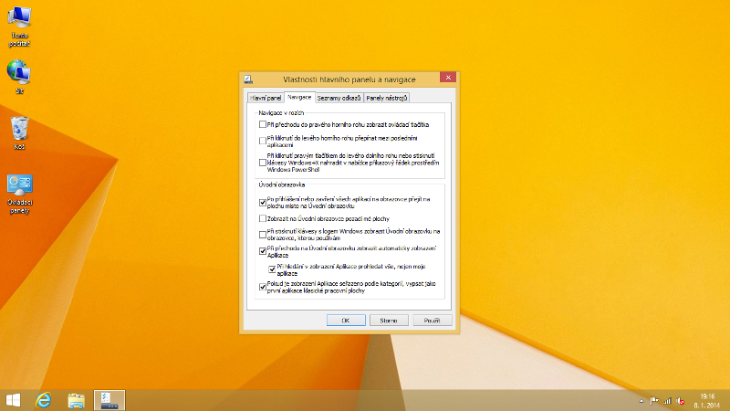 Patřičné volby se ukrývají na jedné ze záložek nastavení hlavního panelu. Zde lze například nastavit, že po přihlášení k systému má být rovnou zobrazeno klasické desktopové prostředí namísto obrazovky Start. Rovněž lze deaktivovat tzv. aktivní rohy a postranní panely, které fungují jako pojítko mezi desktopovým a dotykovým prostředím. Pak už jen stačí nastavit desktopové programy jako výchozí pro otevírání vybraných souborů a ty nejpoužívanější si připnout na hlavní panel.