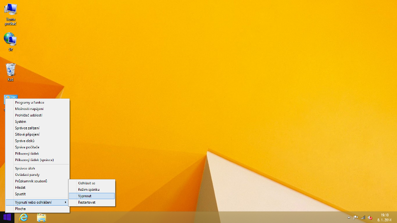 Tlačítko Start ve Windows 8.1 přece jen má své vlastní menu, tedy lépe řečeno kontextové menu otevírané kliknutím pravým tlačítkem myši. Nabízí rychlý přístup do zákoutí systému, která jsou bez tradiční nabídky Start poněkud z ruky. Zároveň umožňuje vypnout počítač rovnou z klasického desktopového prostředí. Není tak třeba přecházet na obrazovku Start a otevírat postranní panel s nastavením, kam Microsoft nesmyslně přemístil tlačítko pro vypnutí systému.