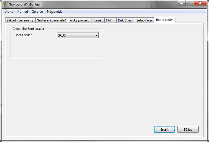 Po stisknutí tl. "Běžet" nastavíme zdrojovou a cílovou cestu. Zdrojová cesta může být i iso soubor ve virtuální mechanice - např. pomocí daemon tools. Poslední co musíme zvolit je Boot Loader - zde vybereme Grub. Pozor! Flash disk bude zformátován!