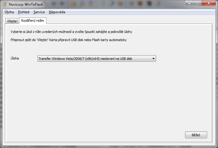 Nejdříve si stáhneme program [url=http://<www.slunecnice.cz/sw/wintoflash/>]WinToFlash[/url]. Rozbalíme do libovolného adresáře a spustíme. Úvodní obrazovku přeskočíme a zvolíme Rozšířený režim, kde vybereme požadovanou úlohu.