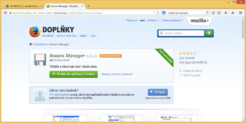 Zdaleka ne všem uživatelům ovšem integrovaná správa relací vyhovuje. Zde tahá za delší konec Mozilla Firefox, který díky rozvinutému ekosystému rozšíření může uživatelům vedle integrované správy relací nabídnout vyspělejší alternativy třetích stran. Vlastní správu relací má například zabudovanou populární rozšíření Tab Mix Plus, ale může jí od něj převzít také Session Manager.