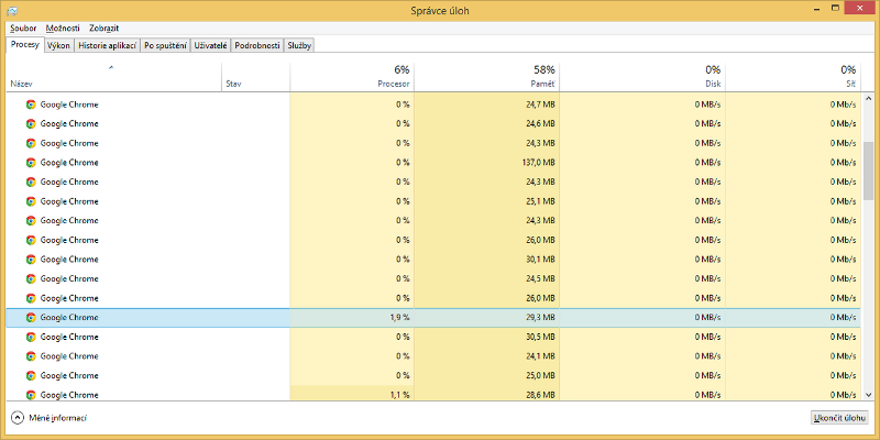 Google Chrome a Internet Explorer jdou ještě dál, protože jednotlivá okna prohlížeče a otevřené weby spouštějí v oddělených a nezávislých procesech. Pokud se na některém z otevřených webů vyskytne problém, mělo by dojít k zavření pouze jeho panelu či okna, nikoliv k pádu celého prohlížeče se všemi otevřenými weby.