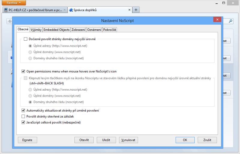 Není tedy od věci JavaScript zkrotit, k čemuž pro Firefox existuje rozšíření NoScript, které brání před útoky typu Cross-site Scripting (XSS) a Clickjacking. Obecně ale zakazuje používat JavaScript mimo weby, kde to uživatel výslovně nepovolil. Eventuálně lze na daném webu blokovat JavaScript třetí strany, tedy třeba reklamního systému či analytického nástroje.