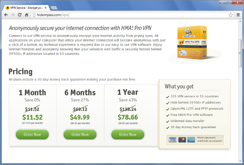 Ještě zajímavější je placená služba VPN Pro rovněž od Hide my ass! Ta rovněž nabízí maskování IP adresy a poskytnutí IP adresy z vybrané země. Oproti Web Proxy však pokrývá veškerou internetovou komunikaci. Nemaskuje IP adresu tedy jen při přístupu na webové stránky, ale i při využití nejrůznějších programů přistupujících k Internetu.