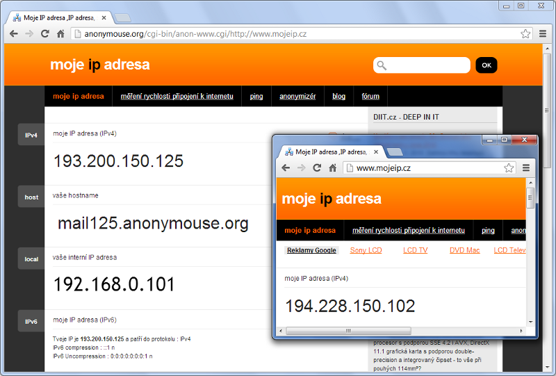 Naším tématem je, jak webové stránce neprozradit IP adresu. Některé uživatele chrání tzv. NAT, kdy se za jednou IP adresou skrývají desítky, stovky i tisíce uživatelů. Je to případ například firemních či školních sítí nebo nových zákazníků některých telekomunikačních operátorů, kteří oproti dřívějšku již jednotlivým uživatelům nepřidělují jedinečnou IP adresu.