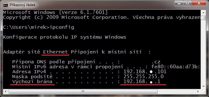 3. Připojíme PC kabelem ke druhému routeru TP-LINK. Opět ipconfig, brána a vstup do nastavení routeru.