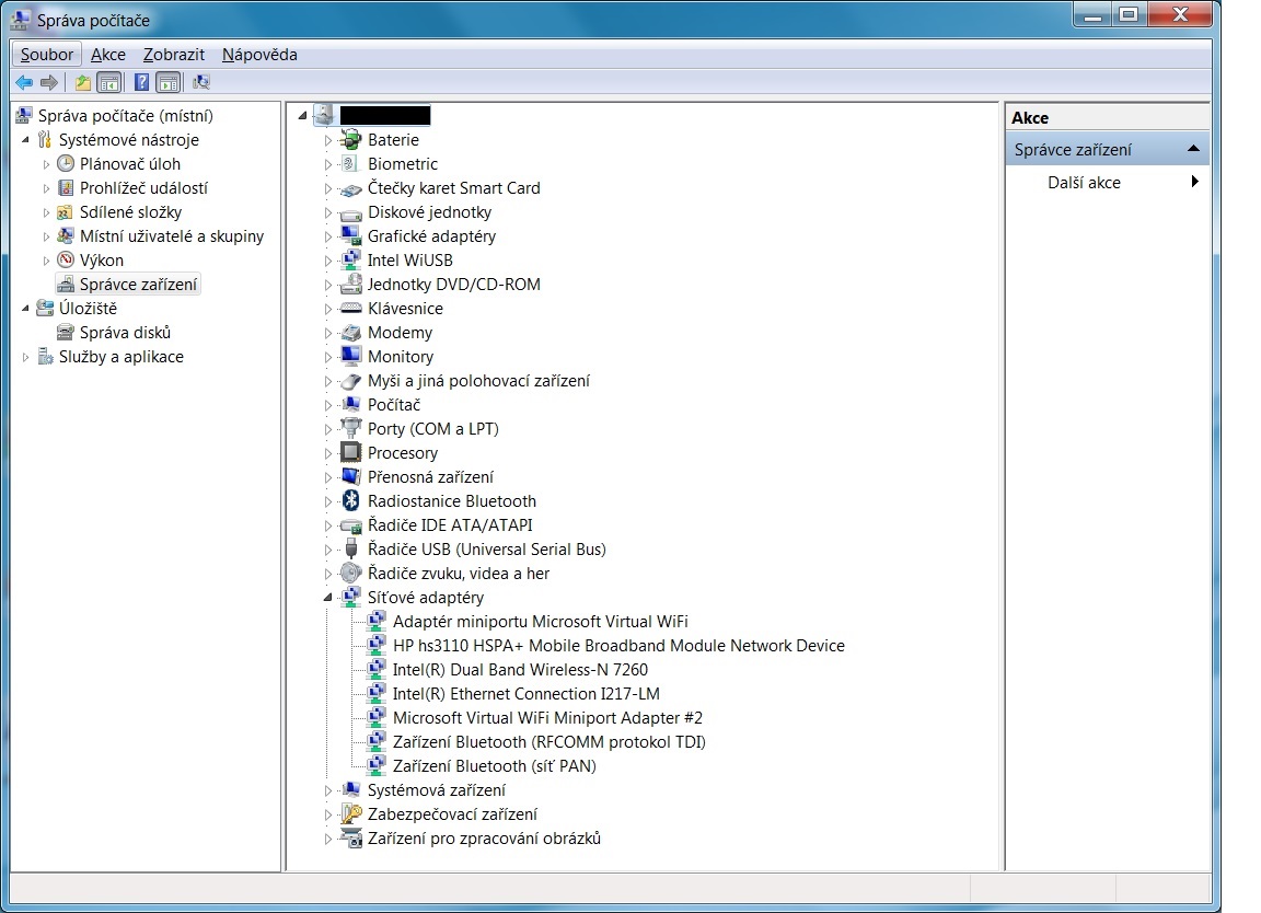 1. První, co musíme ověřit je, zda máme v PC správně nainstalovánu síťovou kartu. Pravoklik na Počítač / Spravovat / Správce zařízení / Síťové adaptéry. Zde zkontrolujeme přítomnost síťových adaptérů. Pro kabel hledejme síťový adaptér ethernet. U WiFi bývá napsáno Wireless, popřípadě název výrobce + protokol 802.11 (b,g,n,ac).