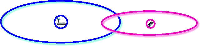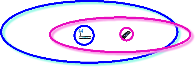 Zde je "router s velkým dosahem". Jak je z obrázku patrné, dosah routeru se skutečně zvětšil, jenže u mobilu zůstal stejný. Mobil tedy síť "vidí", ale nemůže se na ni připojit, protože jeho WiFi "nedosáhne" na anténu routeru, tudíž router o mobilu "neví". Tedy "router s velkým dosahem" nic neřeší.