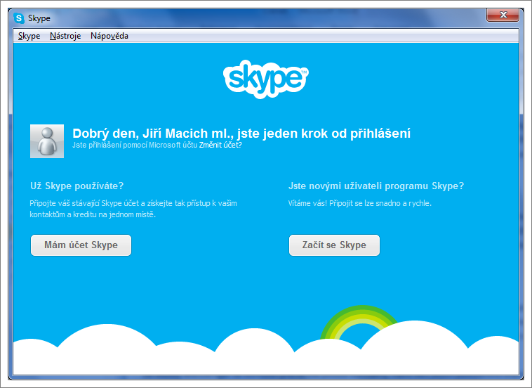 Jakmile máte nainstalováno, stačí se po spuštění programu Skype přihlásit namísto přes Skype ID prostřednictvím Microsoft Account. Pokud už Skype 6 používáte, odhlaste se a znovu se přihlaste, ovšem tentokrát přes Microsoft Account. Na přihlašovací obrazovce je to jedna ze tří nyní existujících možností pro přihlášení ke službě Skype.