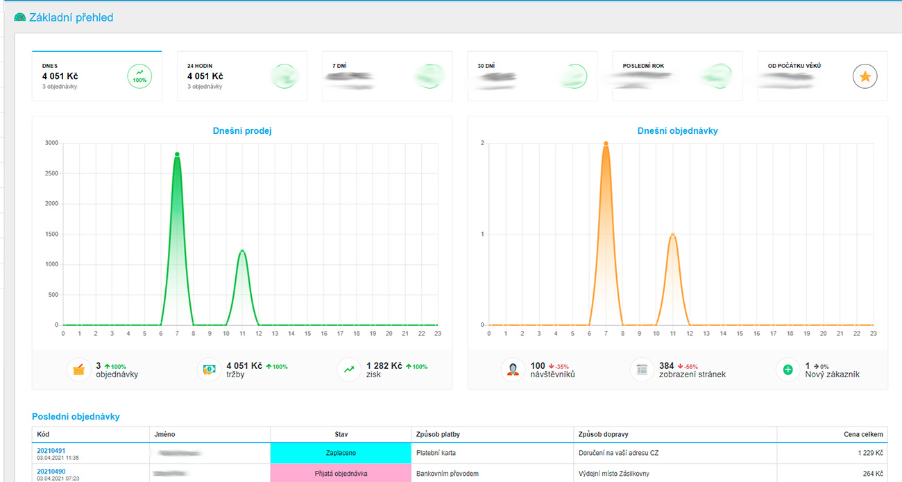 - Kompletní informace o eshopu (počet objednávek, celková cena, marže, náklady)
