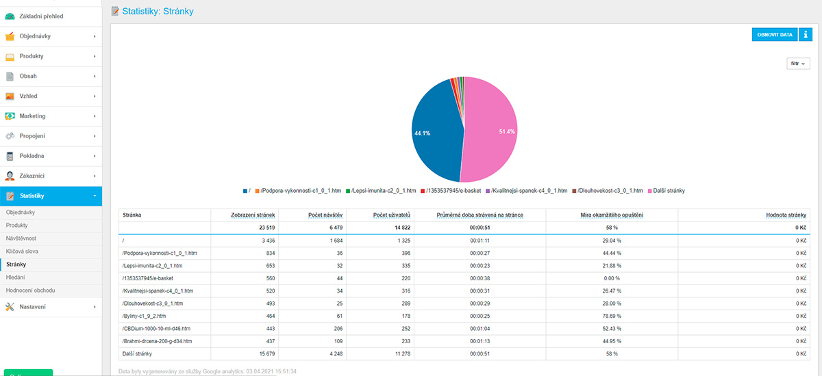 - Kompletní napojení na Google Analytics a vykreslením dat přímo do eshopu - neni nutné chodit na Google analytics