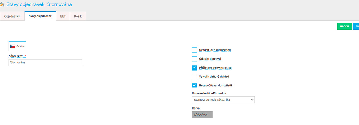 - Možnost nastavit u jednotlivých stavů různé akce (odeslání emailů, přičtění / odečtení skladu, vygenerování štítku dopravce atd.)