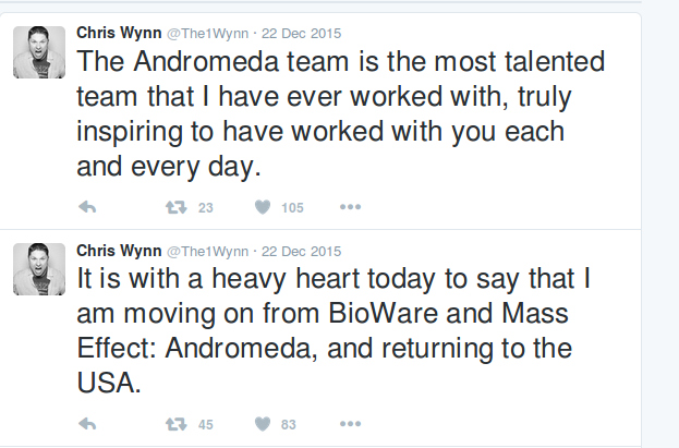 Vypadá to jako přátelský rozchod ale bůh víc, co se tam stalo. Chris Wynn, který dohlížel na celý vývoj nového pokračování oznámil na svém Twitteru odchod ze společnosti. Podle jeho slov je tým, který stojí za vývojem nového dílu Mass Effectu s titulem Andromeda ten nejtalentovanější, s jakým kdy pracoval. BioWare vyjádřilo zklamání a ujistilo, že vývoj bude pokračovat dál. Hra má vyjít na konci příštího roku.