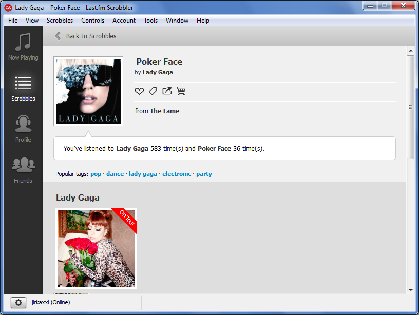 Třetí sekce umožňuje přístup k vlastnímu uživatelskému profilu se základními statistikami o nejposlouchanější hudbě. Podrobnější statistiky jsou nadále jen na webu Last.fm, což má být pravděpodobně zoufalý pokus uživatele přivábit na webové stránky, kde provozovatel služby vydělává na zobrazované reklamě. Poslední sekce pak poskytuje přehled o tom, jakou hudbu právě poslouchají přátelé.