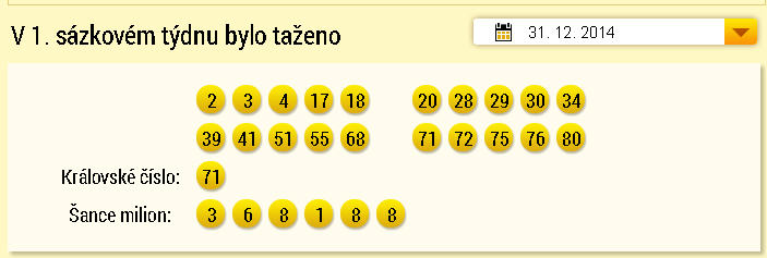 Jak už zde správně zaznělo, dne 31.12.2014 bylo vylosováno, coby královské číslo, číslo 71 a to má v modré skupině přiřazené uživatel mike007 :bigups: :bigups: