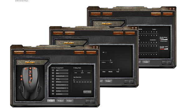 Zbylá tři tlačítka této myši tvoří klasické levé a pravé tlačítko spolu s kolečkem uprostřed plnícím úlohu prostředního tlačítka. Kolečko podporuje jen vertikální posun. Vedle horizontálního posunu chybí též funkce pro rychlejší posun. Všech sedm tlačítek je programovatelných v dodávané utilitě s jednoduchým intuitivním ovládáním, ovšem s poněkud svérázným designem, který ale u herního zařízení není překvapující.