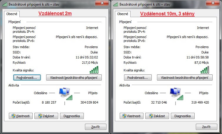 Abych byl objektivní musím říci, že mám ntb, který umí 802.11n, nicméně „Turbo QAM“ nepodporuje. Spojení s routerem běžně na 217 Mbit/s, ve vedlejší místnosti 195 Mbit/s. Pokud na 10m přes 3 stěny 87 Mbit/s. Pokusy provedeny v klasickém paneláku, v okolí nalezeno 11 WiFi sítí. Max. rychlost přenosu dat je na 802.11n 13,5 MB/s, na 802.11b/g 3 MB/s. Router tak bez problémů umožnil přehrávání videa HQ na několika ntb + vyzkoušeno přehrávání stejného souboru na TV pomocí DLNA. Vše bez jediného zaváhání.