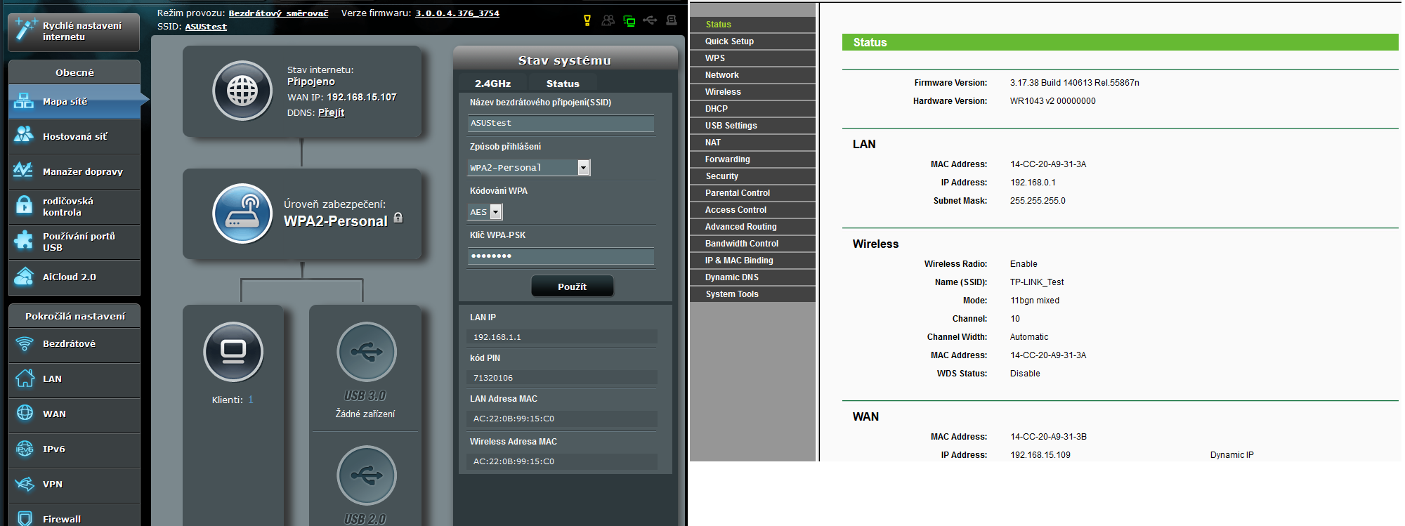 - TP-link má administrační webové rozhraní v angličtině, u Asusu lze zvolit češtinu