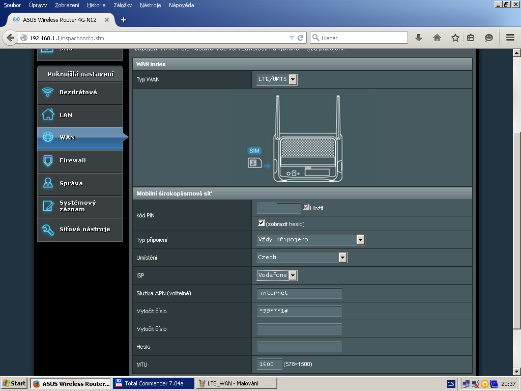 A nyní k LTE. Respektive k mobilnímu signálu, protože router umí nejen LTE, ale podporuje i starší (3G a 2G) technologie. Vloženou SIM kartu router sám detekuje, dokonce správně identifikuje, jaké služby SIM umí – použil jsem kartu ze svého mobilu a byly rozeznány i hlasové služby. Pokud měníte nastavení WAN sítě z pevné do LTE a máte kartu blokovánu PINem, doporučuji restart routeru. Při nastavování LTE mi nešel zadat PIN pro SIM kartu, po restartu routeru již bylo vše v pořádku.