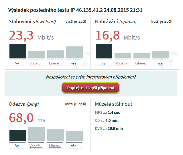 Ping má samozřejmě vyšší hodnotu, než u pevného připojení, to je ovšem dáno technologií.