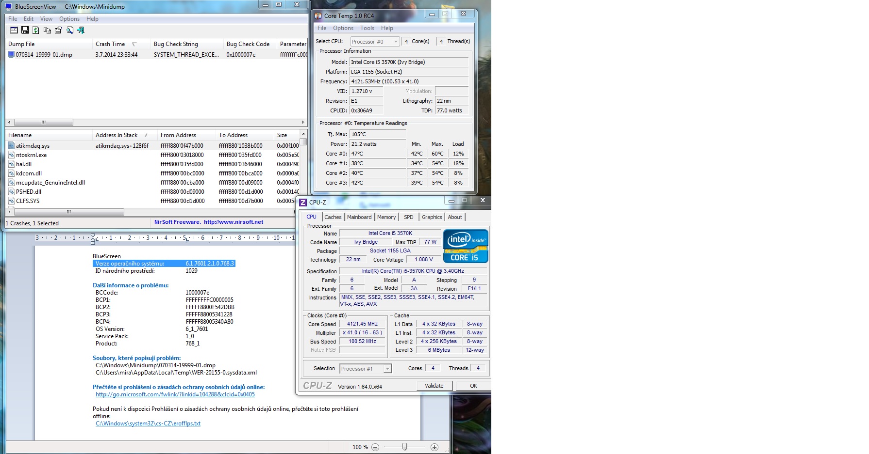 Zdravim, do ted už asi celkově po 7 mi spadl PC a hodil mi Blue screen pokaždé to samé.Psalo mi to tam problém s atikmdag.sys tak jsem vyzkoušel věci které jsou na netu jakož rozbalit atikmdag.sy_ a soubor co jsem z něj vytáhl přesunout tam kde je puvodní. To ale nepomohlo, odinstaloval jsem i smazal soubory od AMD přes nějaký program který je našel všechny a smazal.Poprvé se mi to stalo když mi hra kterou jsem chtěl spustit vypsala že musím aktualizovat ovladač grafiky, aktualizoval jsem ji ale při aktualizaci mi spadl pc a Blue screen.. od té doby to parkrát padalo 1 za 3 dny nějak tak. V čera jsem šel do BIOSU a přetaktoval PC z 3.8 na 4.1, 1 den nic a potom mi to začalo padat, 3x za dnešek (když chci jít do BIOSU a vrátit to z5 tak i když mačkám DEL/F2 tak mi to vyhodí jestli chci spustit Windows 7 nebo jakýsi nástroj).Potřebuju poradit co s tím,Budu rád za každou radu. Zde vám tu dám obrázek s pár věcma: