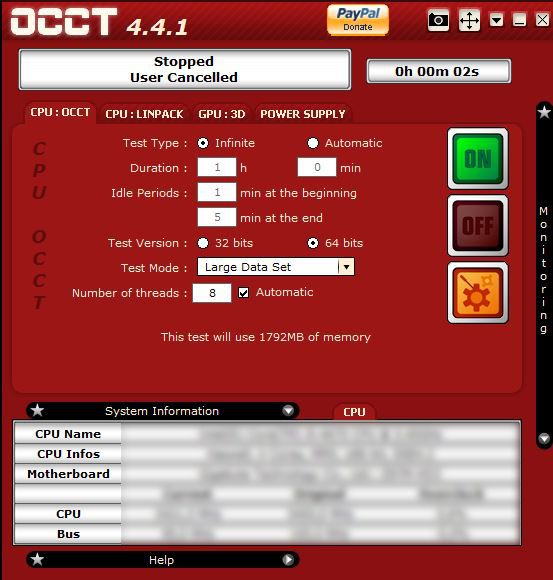 OCCT spusť a v úvodním okně vše nastav jako na screenshotu v příloze. Tlačítkem ON spustíš test, testuj cca 15 min na každý mód (large, medium, small; data set). V okně nahoře uvidíš pokud dojde k nějaké chybě.