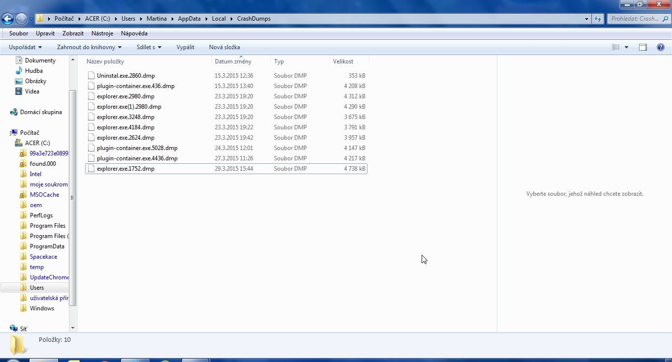 Ještě jsem našla nějaké velké soubory, kde je většina z nich označena explorer... (cesta ..... AppData/Local/CrashDumps) zde: http://leteckaposta.cz/181453467