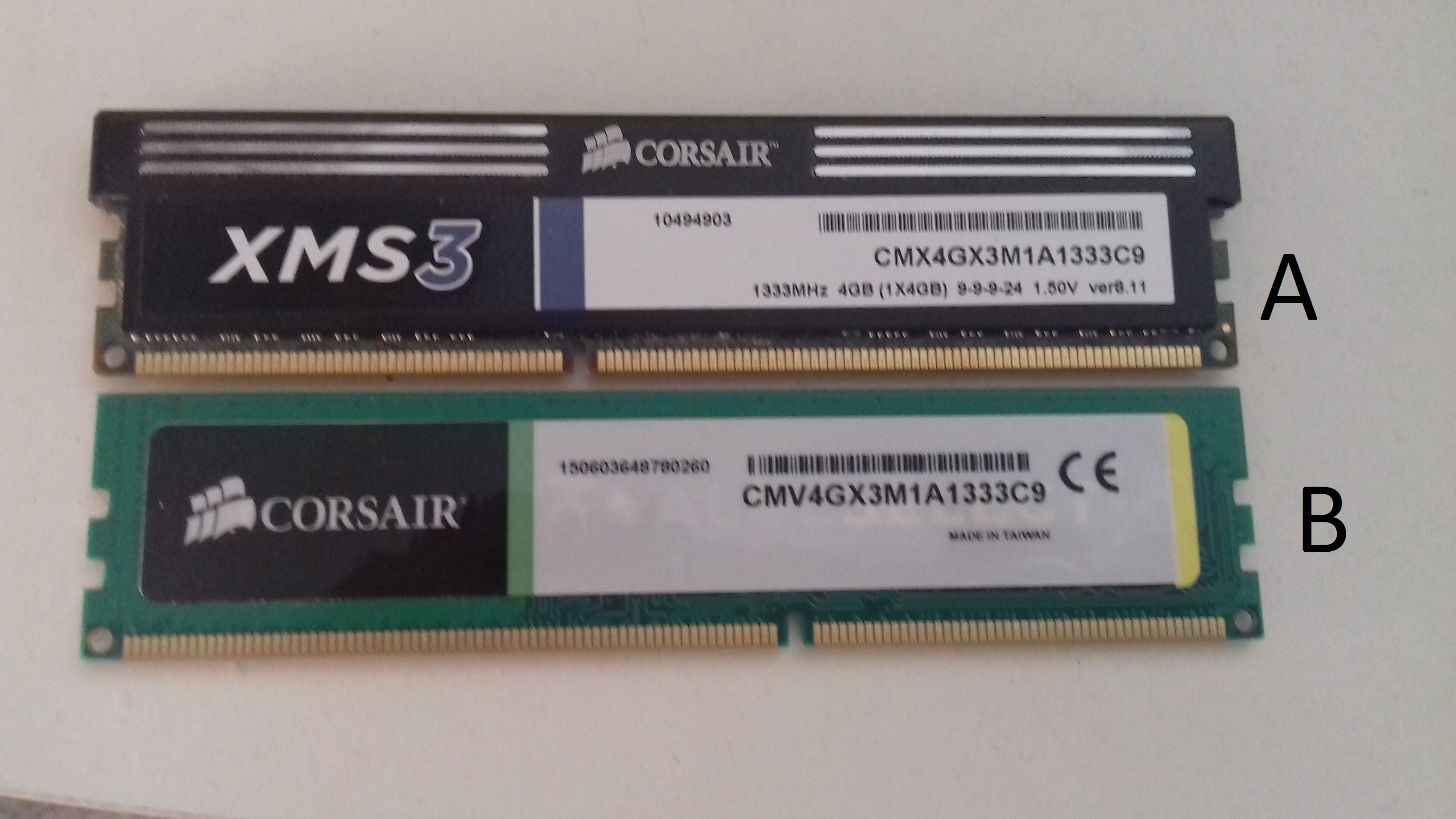 V PC jsou paměti - viz foto. Při poslední BSOD byla osazená paměť B, ta byla v sestavě od začátku a po několika letech byla doplněná pamětí A.