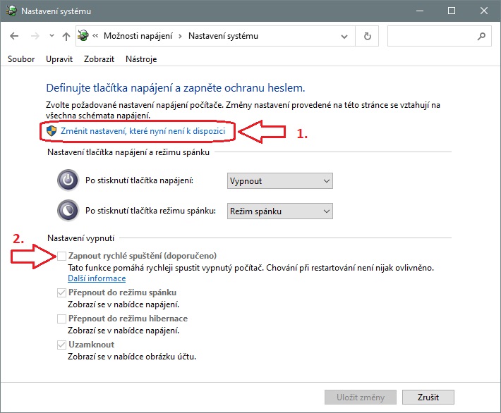 Abys mohl vypnout rychlé spuštění, tak musíš nejdříve kliknout na položku "Změnit nastavení, které nyní není k dispozici". Až pak se ti zpřístupní možnost změny. Viz obrázek níže.