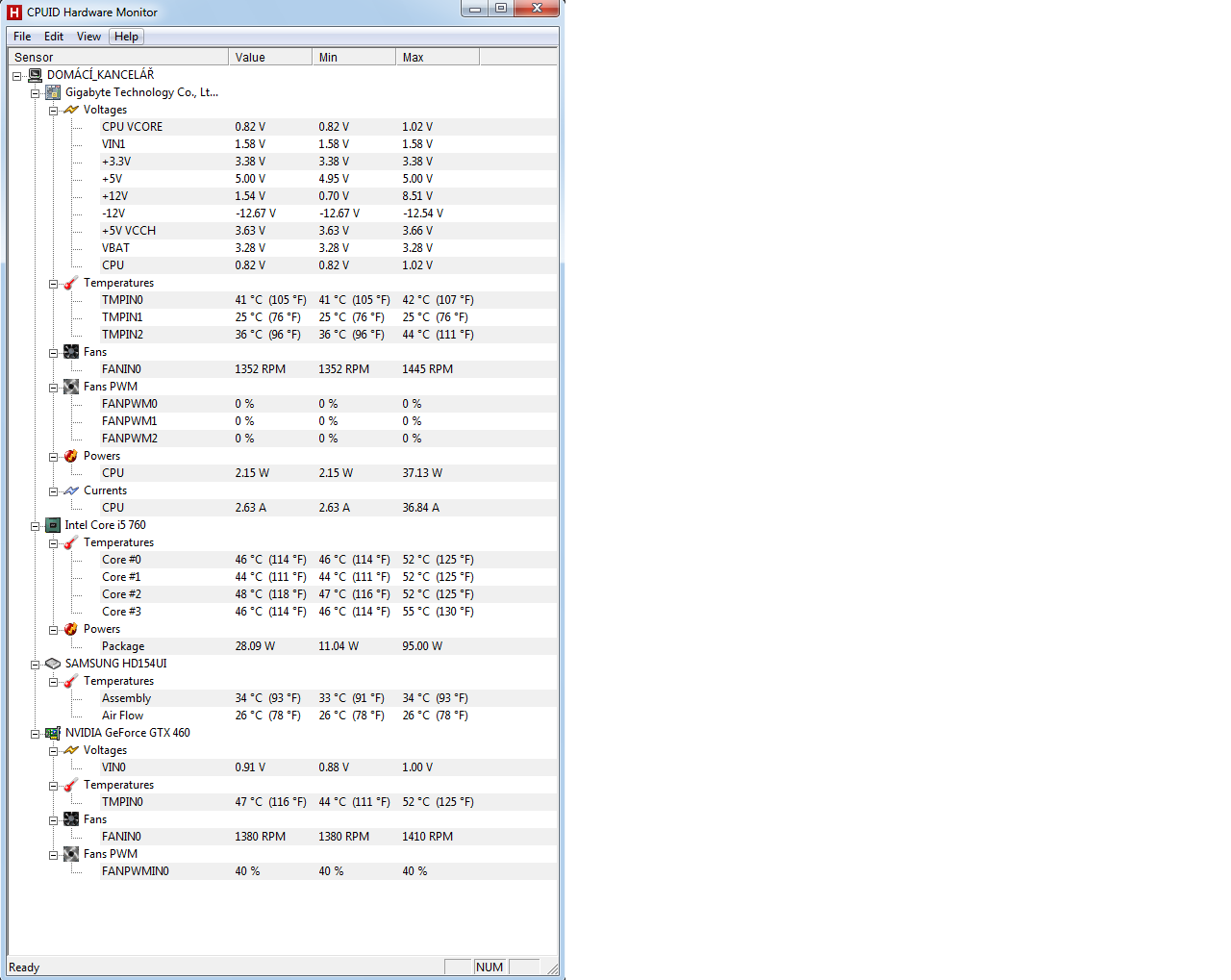 Tak to minulé měření nebylo asi úplně v klidu. Před měřením jsem hrál, čekal tak půl hodinky a pak měřil. Teď jsem udělal nové měření, kdy jsem zapnul PC a cca třičtvrtě hodiny jsem jen brouzdal na netu a teploty jsou nižší. Viz příloha.