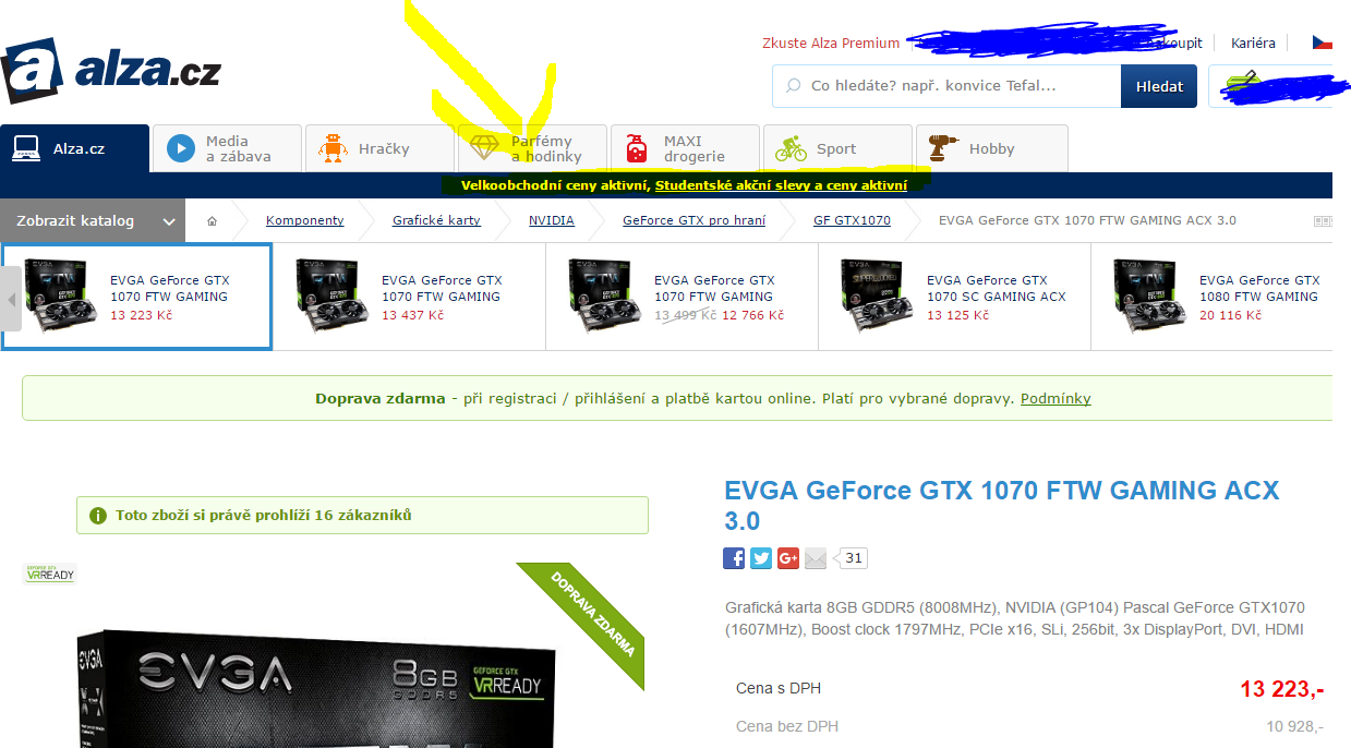 konkrétně na EVGA GeForce GTX 1070 FTW GAMING ACX 3.0, tak má cenu 13 223,- a když se odhlásím, tak cená je furt stejná.