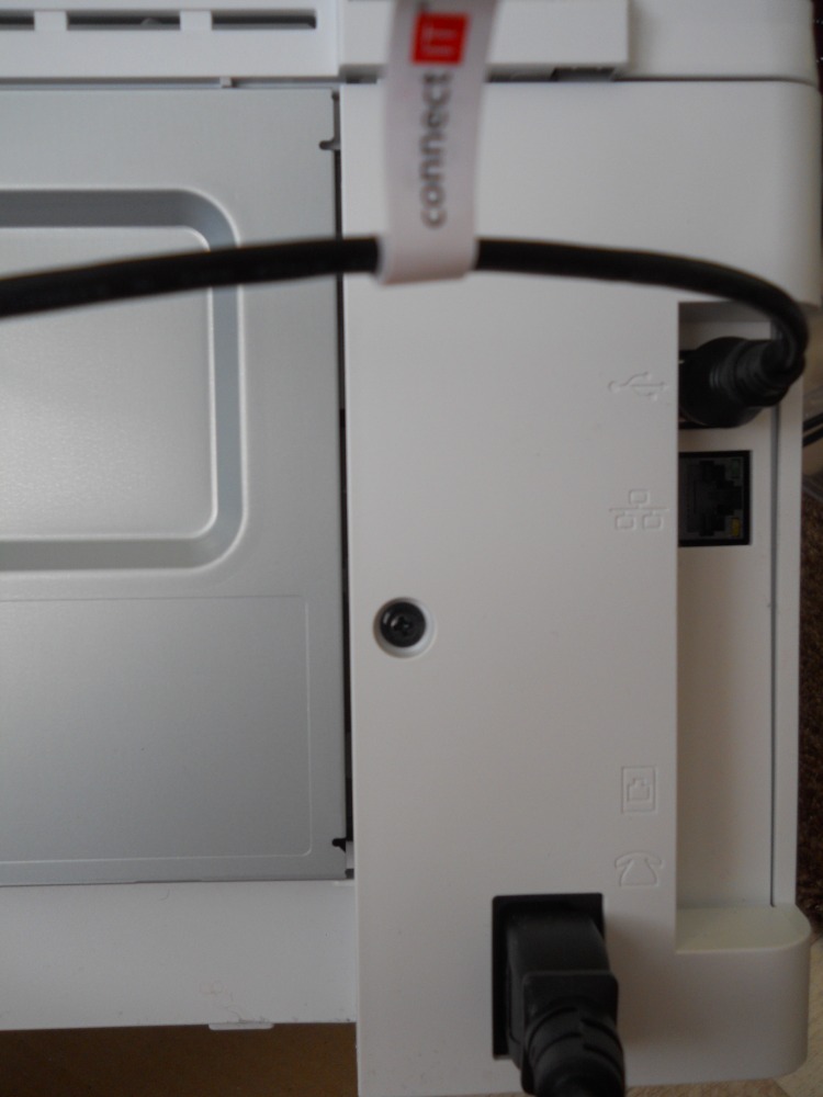 Tiskárna má na zadní straně 3 zdířky. Je zapojena 2 kabely (ke zdroji a k PC, 3.zdířka je volná).