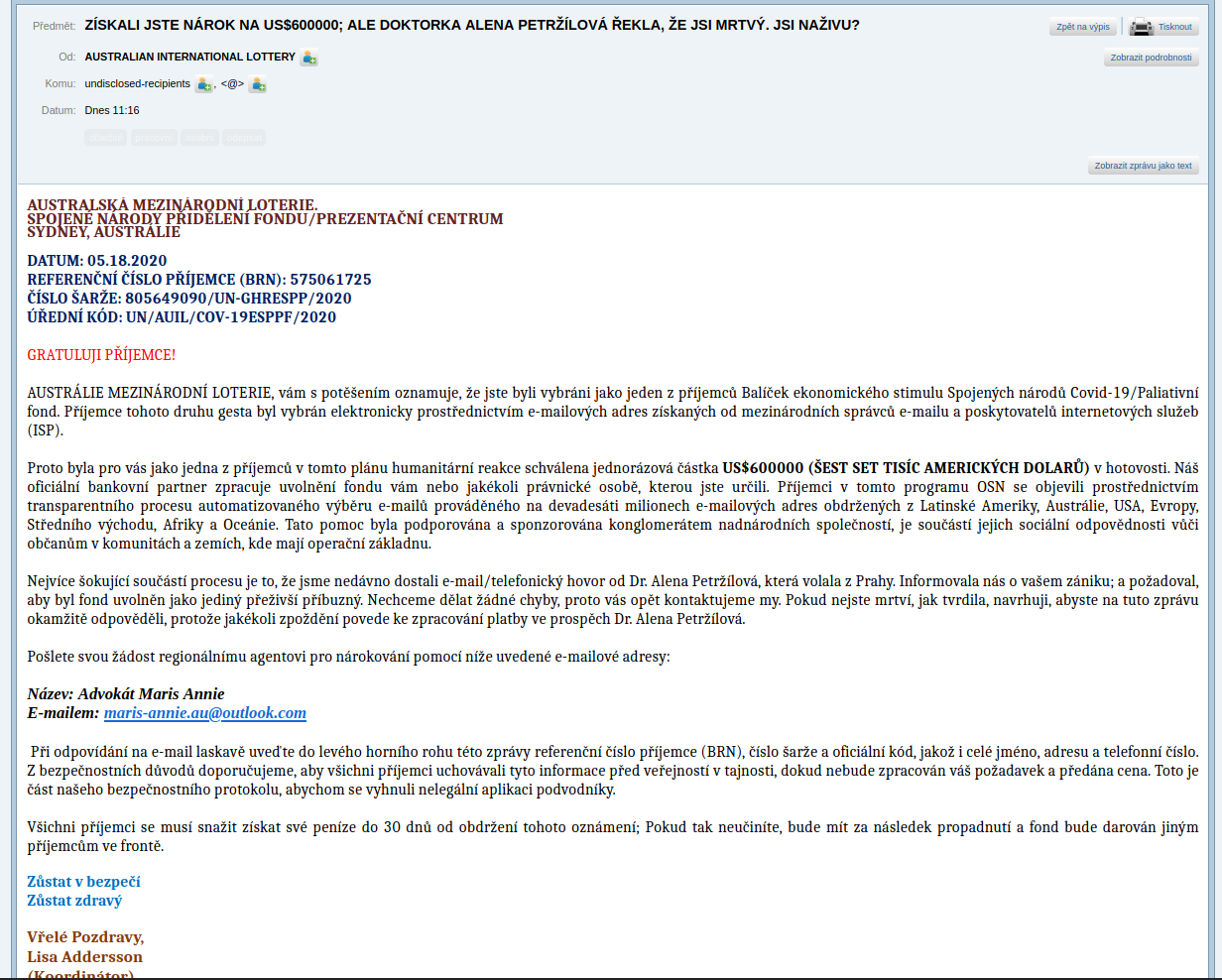 Nejvíce šokující součástí procesu je to, že jsme nedávno dostali e-mail/telefonický hovor od Dr. Alena Petržílová, která volala z Prahy. Informovala nás o vašem zániku; a požadoval, aby byl fond uvolněn jako jediný přeživší příbuzný. Nechceme dělat žádné chyby, proto vás opět kontaktujeme my. Pokud nejste mrtví, jak tvrdila, navrhuji, abyste na tuto zprávu okamžitě odpověděli, protože jakékoli zpoždění povede ke zpracování platby ve prospěch Dr. Alena Petržílová.