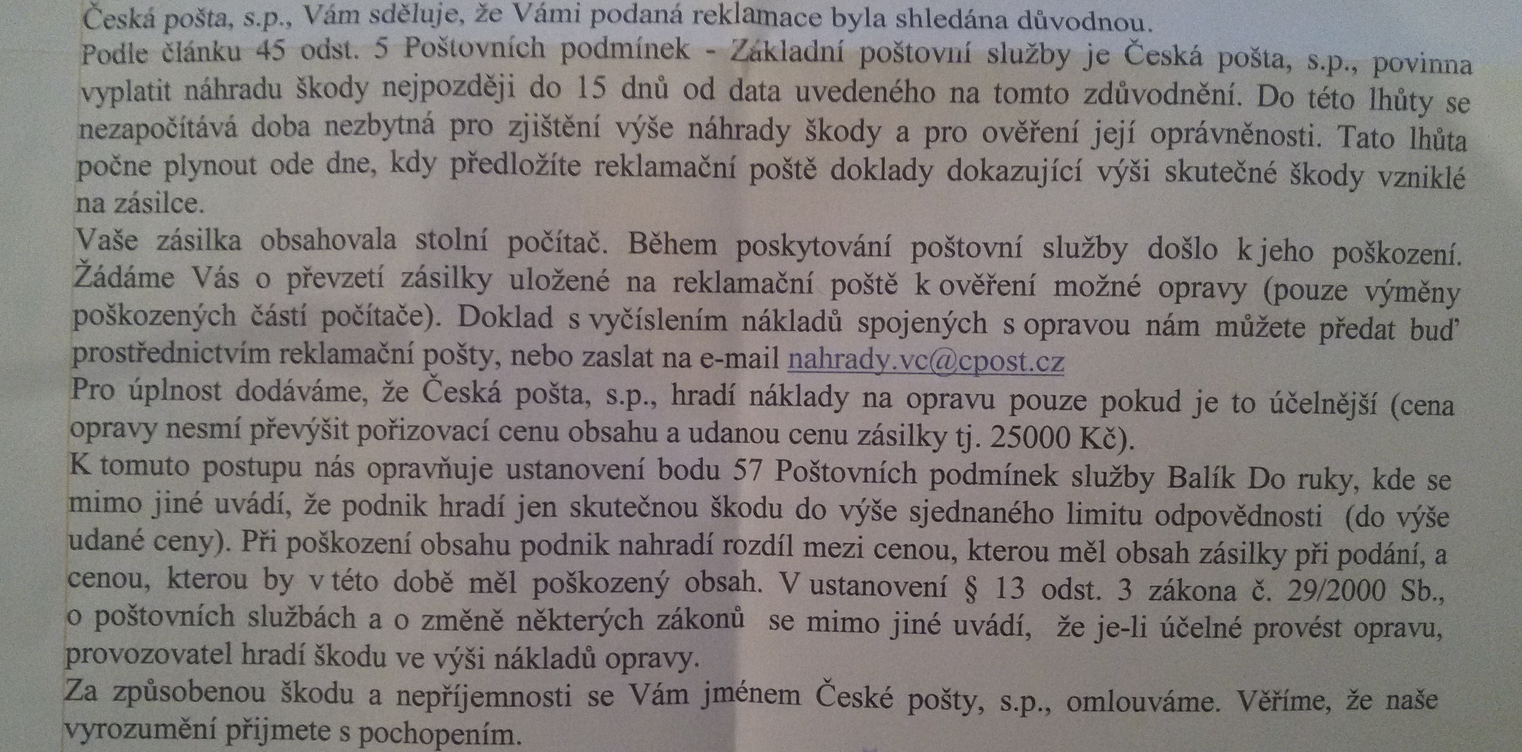 Okamžitě jsem s tím jel na poštu, sepsal reklamační list. Dnes mi přišel dopis.