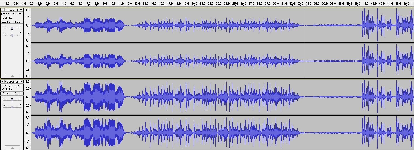 Je příliš hlasité intro proti mluvenému slovu, stačilo ho stáhnout o 6dB a je to ok. A v záznamu hlasu je na začátku slyšet(v audiacity i vidět) přebuzení.