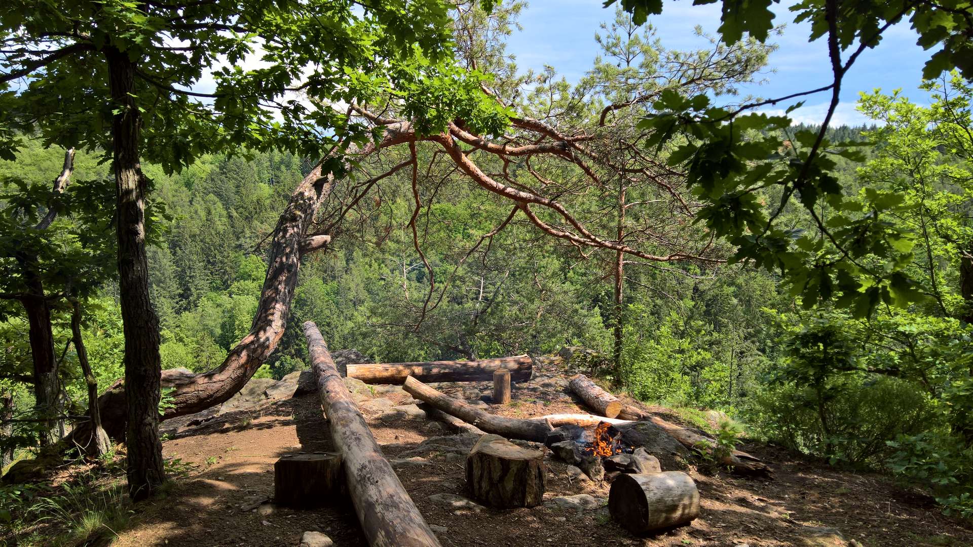 tak lidi tam choděj, ale zástupy to fakt nejsou ani zdaleka... na stejný úrovni dole pod skálou je převis s ohništěm, ale místa na přenocování je tam tak pro pár lidí... parkování buď na kraji města, nebo na kraji lesa u vedlejší vesnice...
