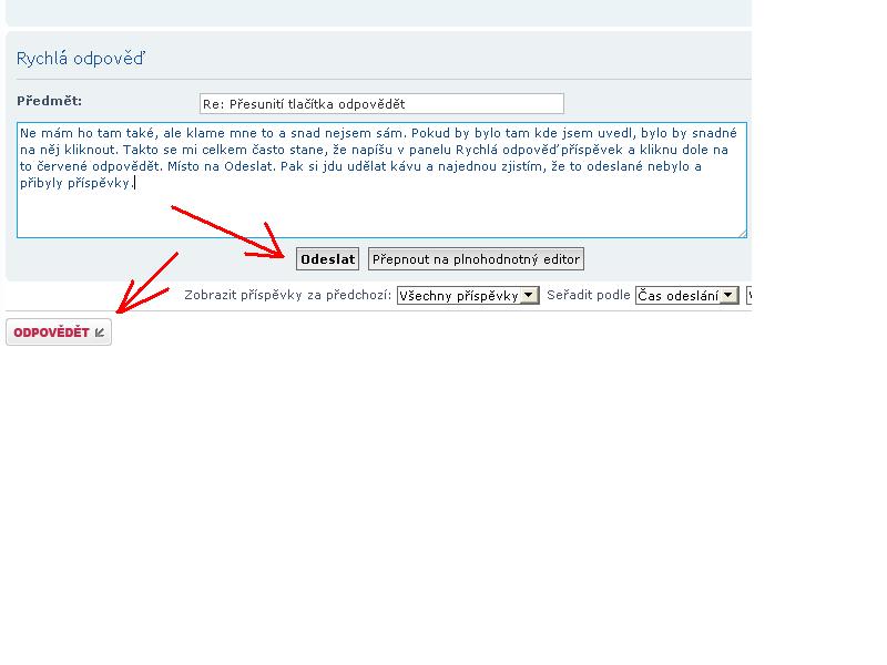 Tvůj návrh stejně neřeší tvůj problém. To tlačítko, které chceš posunout dolů, dělá úplně to samé, co to velké spodní. Co by se teda změnilo? Pokud používáš rychlou odpověď, mátlo by tě to ještě víc