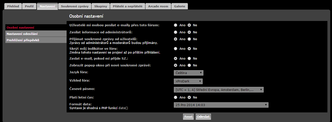 Zkus uživatelský panel, nastavení odesílání ..