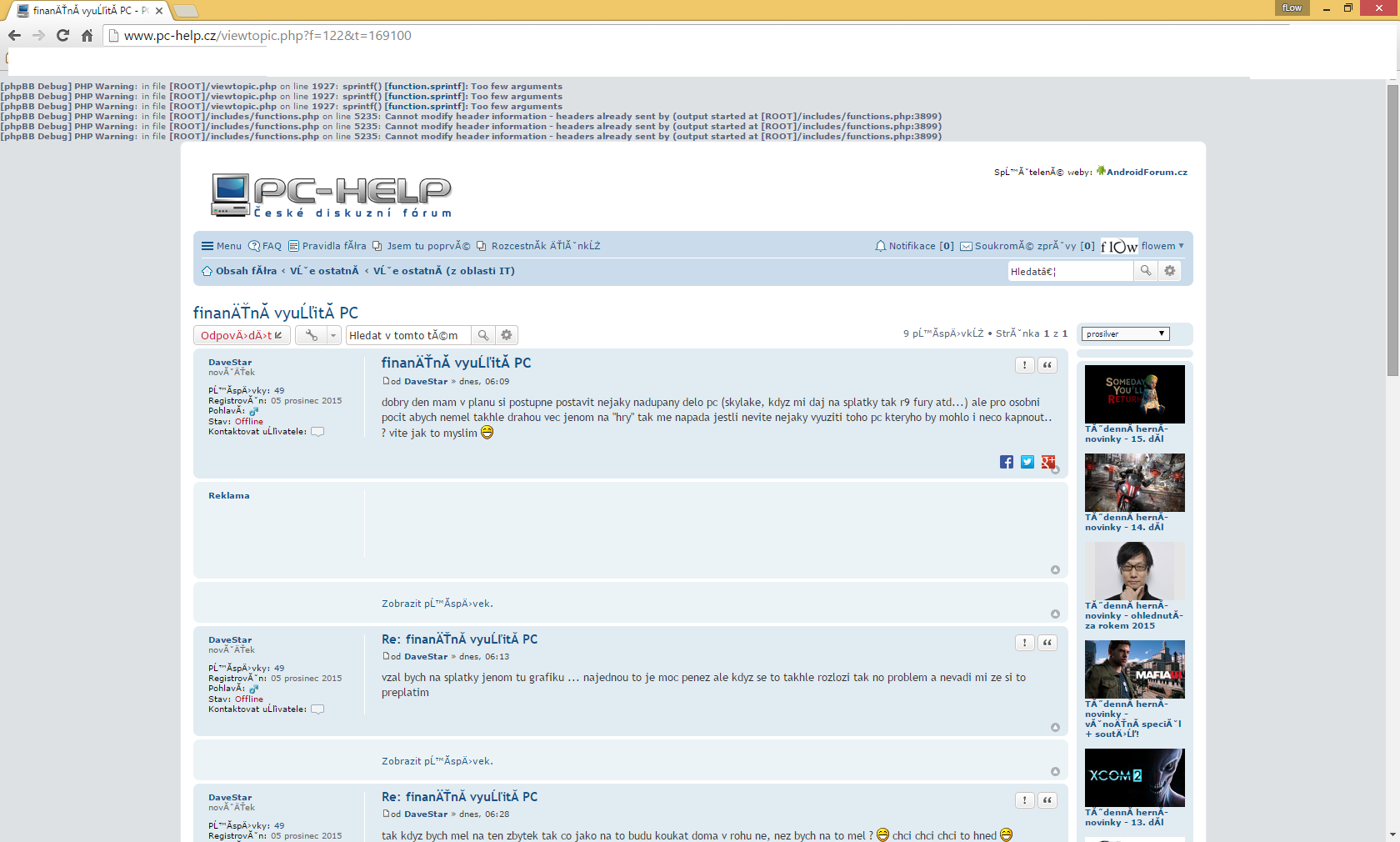 Zdravím, dneska jsem zapl pc-help a na hl. stránce je vše v pohodě, ale když otevřu nějaký téma (nedělá to u všech), tak mám úplně nahoře nějaký errory nebo co a nezobrazují se háčky a čárky, ale nějaky divny znaky(příloha). Je to dost otravny a nejde nic přečíst, čím to může být? Začalo to dělat dneska, ještě včera to šlo normálně. Nic jsem neinstaloval, tak jak jsem PC včera vypl, tak jsem ho dnes zapl a najednou tohle.