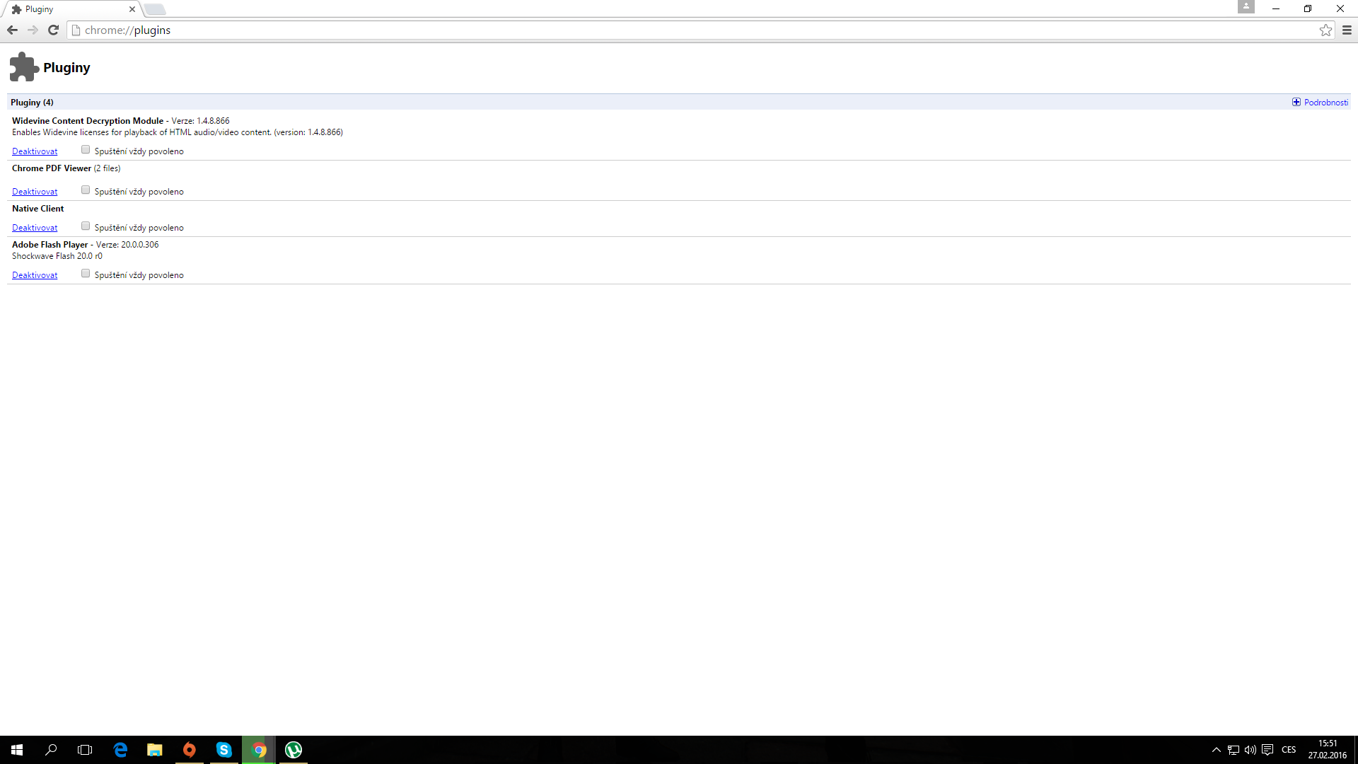 do adresy napiš chrome://plugins a dej sem screenshot, nebo to označ jako text a zkopíruj to sem, já se v tom nějak prohrabu