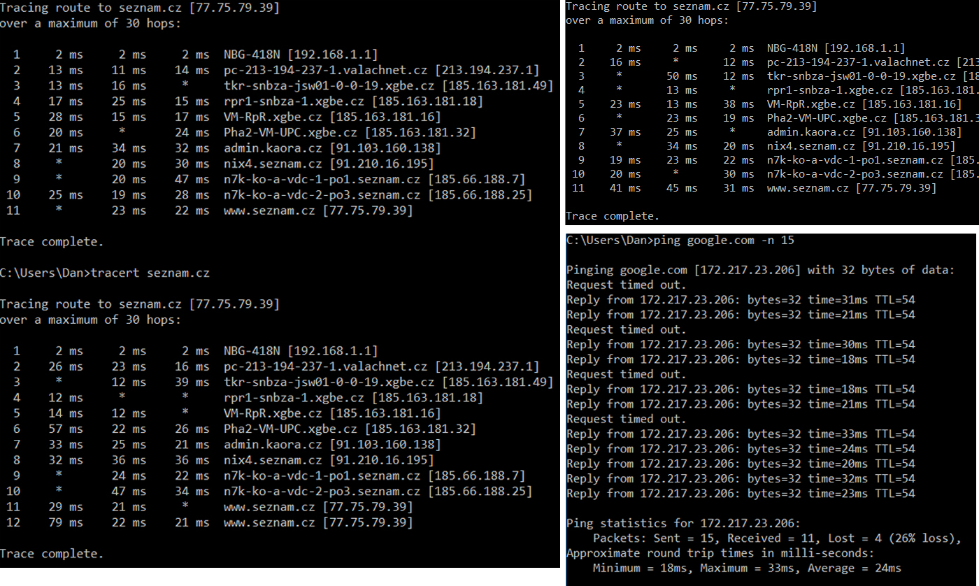 Zdravím, jak je napsáno v názvu tématu, mám problém se ztrátou packetů. Obvykle se ztratí tak 30% packetů. Problém začal před 4 dny, ale vůbec nevím proč. Při klasickém surfování na internetu to jde znát a je jedno jestli je 15:00 nebo půlnoc, packet loss je stále stejný.