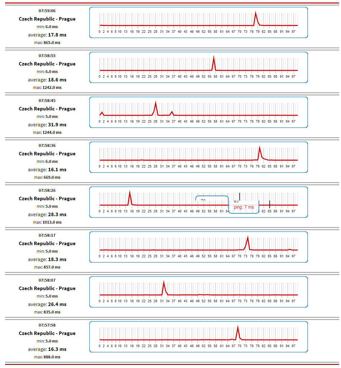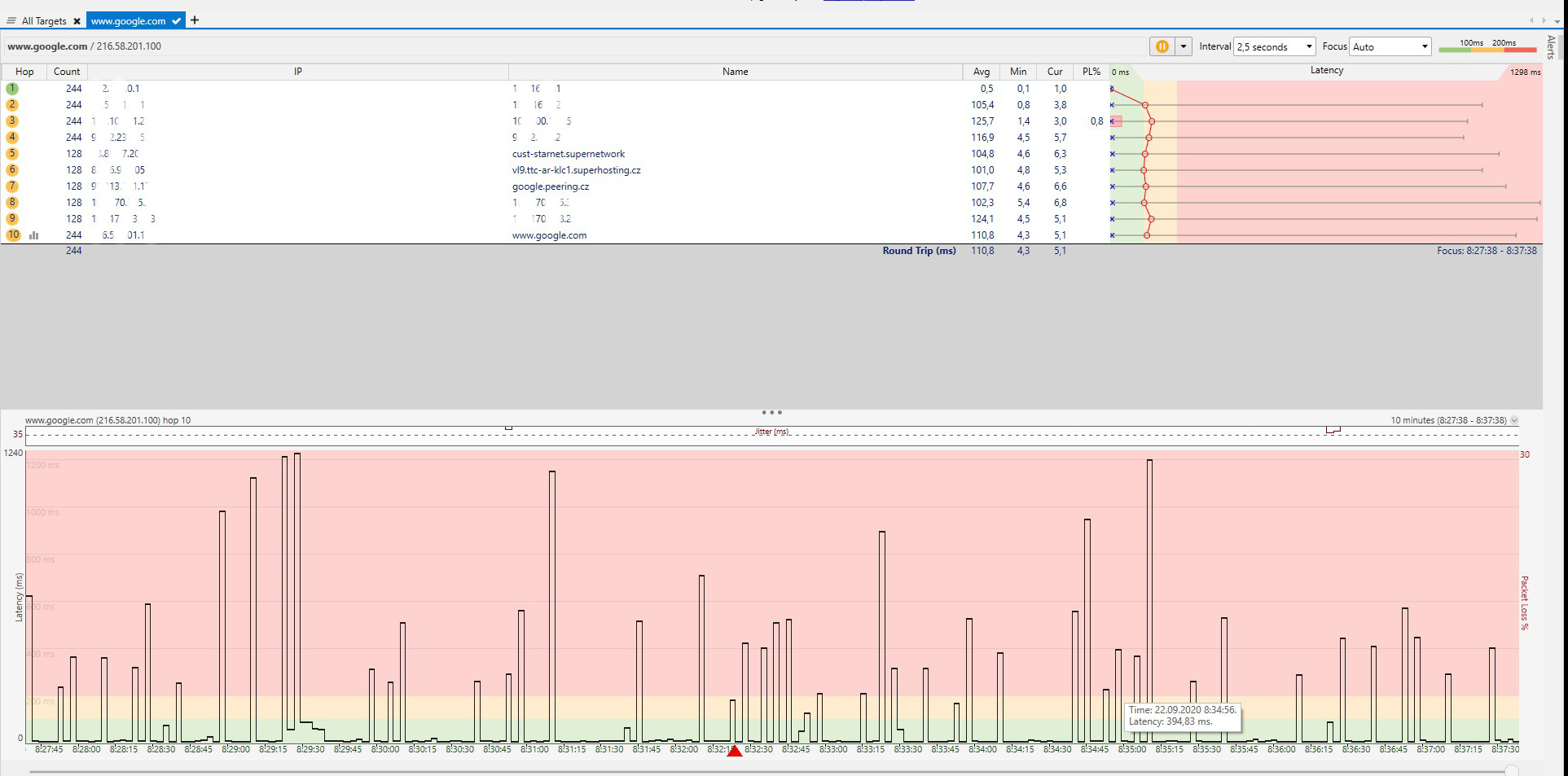Zdravím, nevíte prosím někdo čím může být takto pravidelné skákající ping po nějakých sekundových intervalech? Posílám obrázek. Internet mám od Starnetu v Č. Budějovicích (ne optiku). Začalo to někdy v květnu, tak jsem je kontaktoval a do léta byl klid, prý přeladili frekvenci nebo něco takového. V létě opět úplně jak přes kopírák tak opět jsem jim dal vědět a opět to bylo v pohodě do teď a zase to skáče. Vždy mi jen zavolají zda už je vše lepší tak jen řeknu, že ok a že se kdyžtak ozvu. Ví někdo čím by to mohlo být až se mi zase ozvou, že bych se s nima pobavil o nějakým dlouhodobějším vyřešení tohohle problému? Děkuju