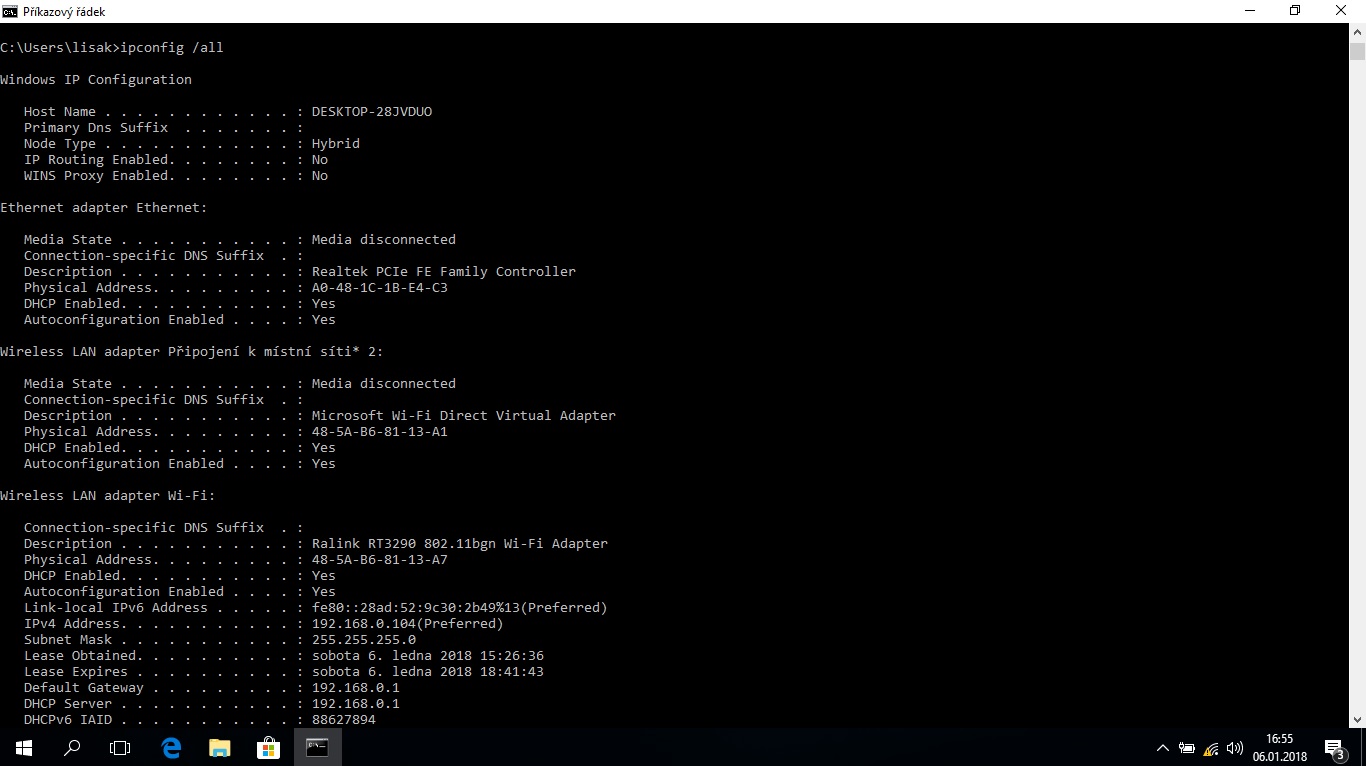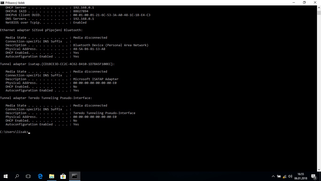 Bude mě zajímat výpis ipconfig -all